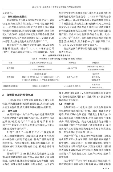外线等) 发生颜色变化或显示荧光现象 [ 31 , 39-40 ] 。 警涂层, 在剪切力、 压力和拉伸力下, 破损释放 CVL