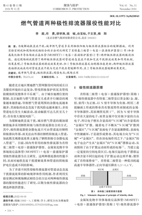 关键词:城市燃气管道; 极性排流器; 阈值电压; 现场应用