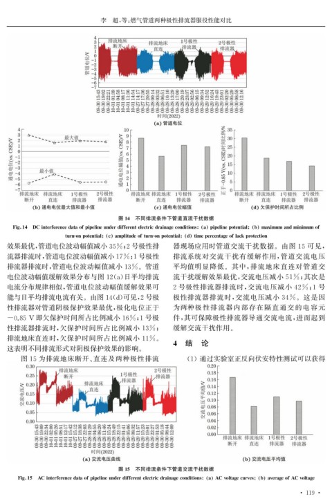 能与日平均排流电流有关。由图14 ( d ) 可见, 2号极 极性排流器排流时, 交流电压减小 34% 。这是因