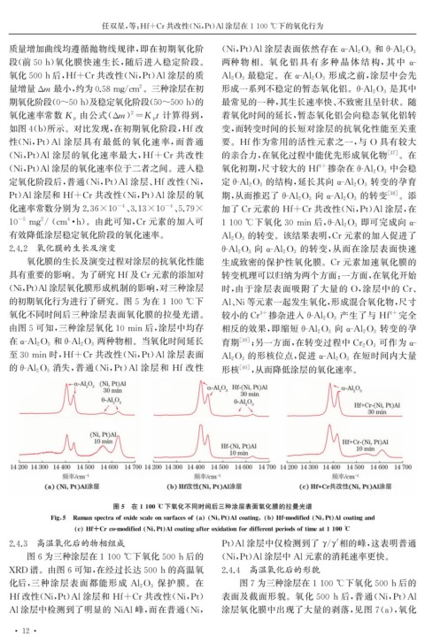 Pt ) Al 涂层和 Hf+Cr共改性( Ni , Pt ) Al涂层的氧 期, 从而推迟了θ-Al 2O 3 向 α-Al 2O 3 的转变 [ 38 ] 。添