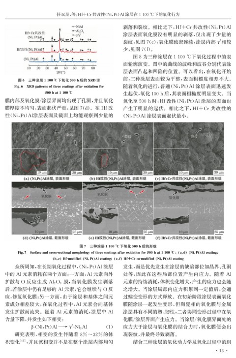 膜内部及氧化膜 / 涂层界面均出现了孔洞, 并且氧化 氧化至500h时, Hf 改性( Ni , Pt ) Al 涂层的表面也