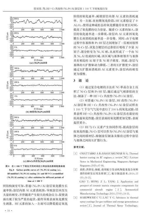 图8 在1100℃下氧化不同时间后三种涂层的表面轮廓曲线 Sin g a p ore , 2020 : 47-68.