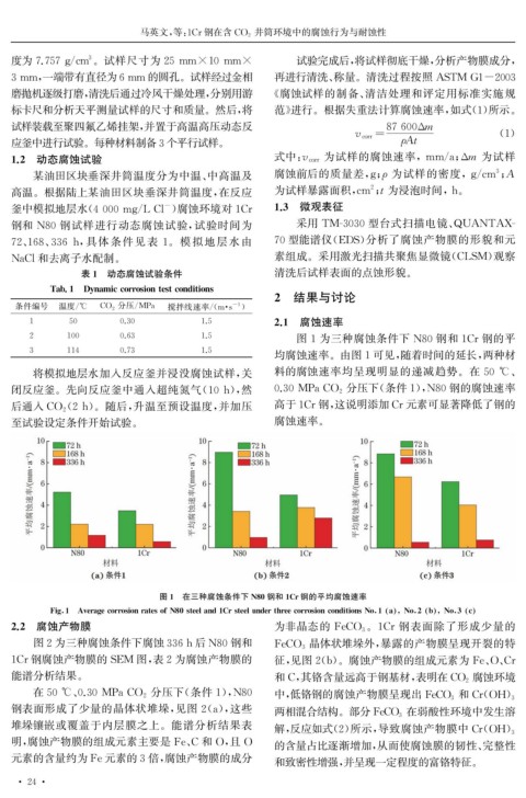 72 、 168 、 336h , 具体条件见表 1 。模拟地层水由 70型能谱仪( EDS ) 分析了腐蚀产物膜的形貌和元