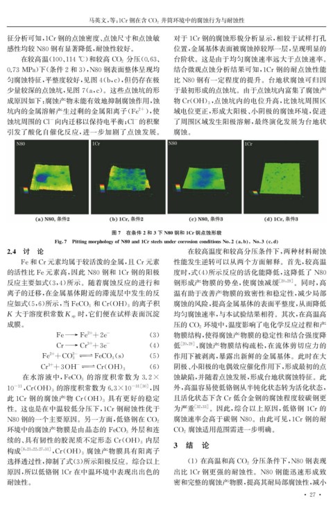 0.73MPa ) 下( 条件2和3 ), N80钢表面整体呈现均 结合微观点蚀分析结果可知, 1Cr钢的耐点蚀性能