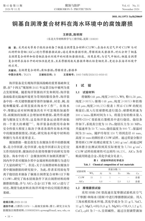 摘 要:采用放电等离子烧结法制备了铜基自润滑复合材料( C13W ), 在海水及空气中对 C13W 与对