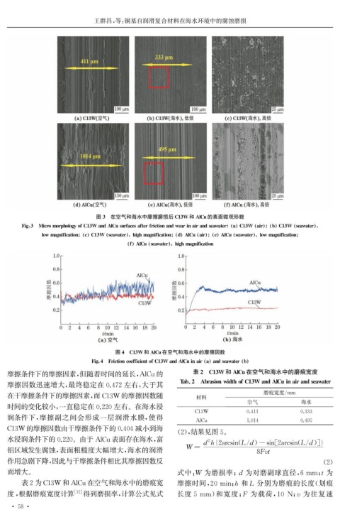 表2为C13W 和 AlCu在空气和海水中的磨痕宽 摩擦时间, 20min ; h 和L 分别为磨痕的长度( 划痕