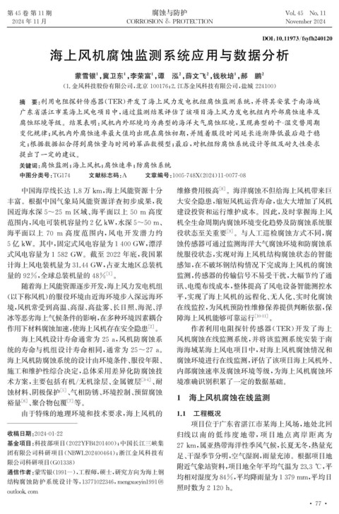 海上风机设计寿命通常为25a , 风机防腐蚀系 风机腐蚀在线监测系统, 并将该监测系统安装于南
