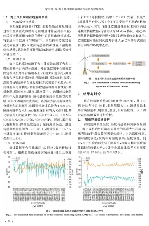 湿度等; 内监测平台通过壁挂方式安装于机舱内, 采 Fi g .1 Datetransmissionofon-linecorrosionmonitorin g