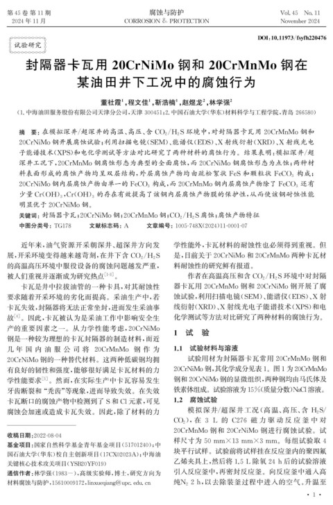 关键词:封隔器卡瓦; 20CrNiMo钢; 20CrMnMo钢; CO 2 H 2 S腐蚀; 腐蚀产物特征